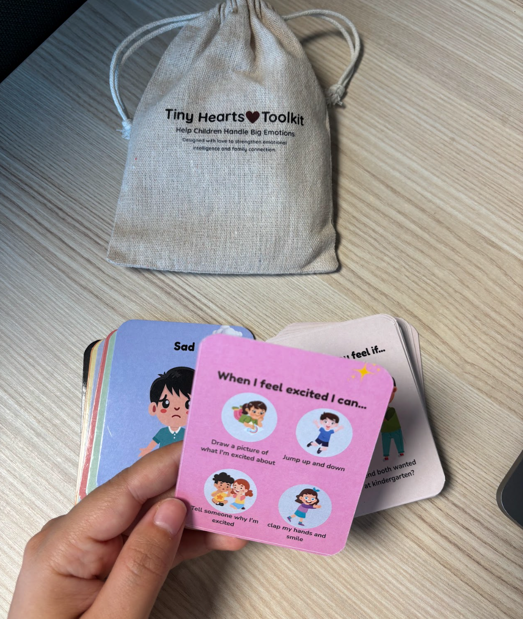 💛 Tiny Hearts Toolkit är ett lekfullt och skonsamt sätt att hjälpa barn mellan 3 och 6 år att utforska sina känslor. Inuti verktygslådan finns 28 illustrerade kort som visar verkliga situationer som barn möter hemma eller på förskolan, vilket gör känslor lättare att förstå.